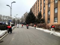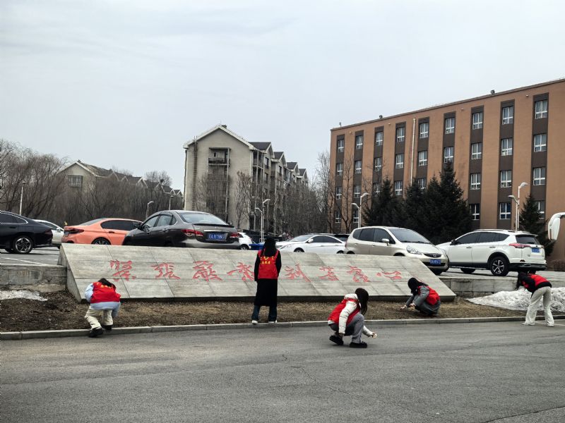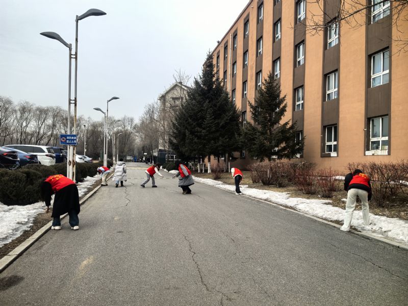在略带寒意的日子里,校园道路旁还残留着些许积雪。一群身着红色志愿者背心的同学,正分散在道路两侧认真清理着垃圾。在教学楼和树木的映衬下,他们忙碌的身影成为校园里一道温暖而靓丽的风景线,用实际行动诠释着志愿服务精神。