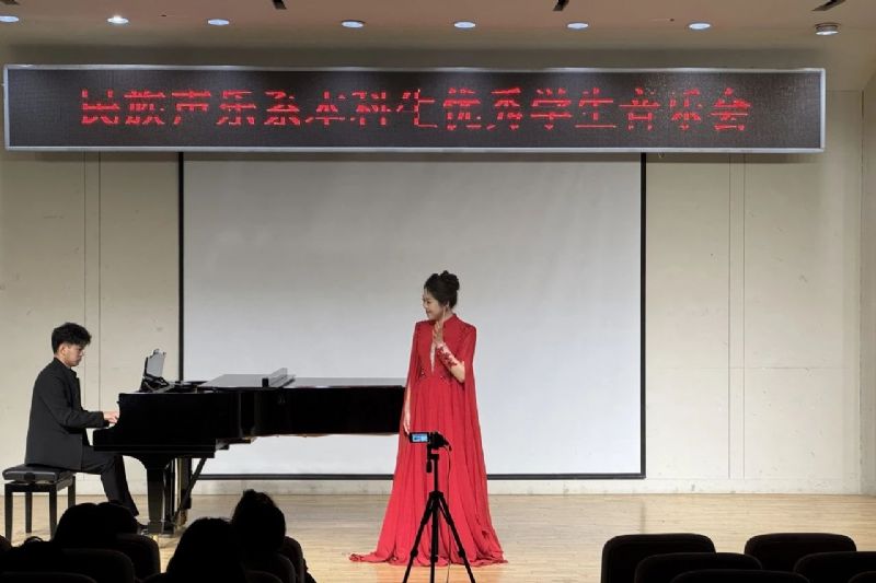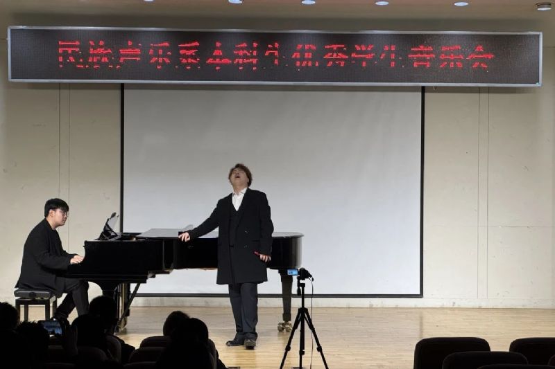 演唱曲目丰富多元,尽显民族声乐的独特魅力。既有洋溢着浓郁地域风情的民歌,如那悠扬婉转的江南小调,带着水乡的温婉与柔情;也有豪迈奔放的西北民歌,仿佛将听众带到了广袤无垠的黄土高原,感受着那片土地上的粗犷与热情。古诗词艺术歌曲则宛如一幅幅古朴典雅的画卷,学生们用细腻的嗓音将诗词中的意境与情感娓娓道来,让人沉醉于古典文化的深邃韵味之中。歌剧选段部分,学生们化身剧中角色,以跌宕起伏的唱腔和生动传神的表演,将歌剧中的爱恨情仇展现得淋漓尽致,引得现场观众沉浸其中,时而屏息凝神,时而掌声雷动。而独具时代特色的创作歌曲,更是展现了学生们对当下生活的敏锐感知和对民族声乐艺术创新的积极探索,旋律中跳动着青春的脉搏,歌词里蕴含着对未来的美好憧憬。