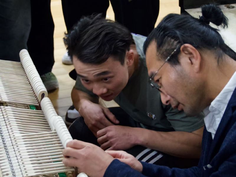 理论讲解结束后,胡海鹏进行了现场实操展示。他以钢琴的中音区为示范区域,运用针刺和弦槌打磨等专业手法,对钢琴音色进行处理。每一个动作、每一个细节,他都耐心讲解,将自己多年积累的经验倾囊相授。在他的操作下,钢琴的音色逐渐发生变化,原本单一的音色变得更加丰富、饱满,现场师生无不惊叹于整音技术的神奇魅力。