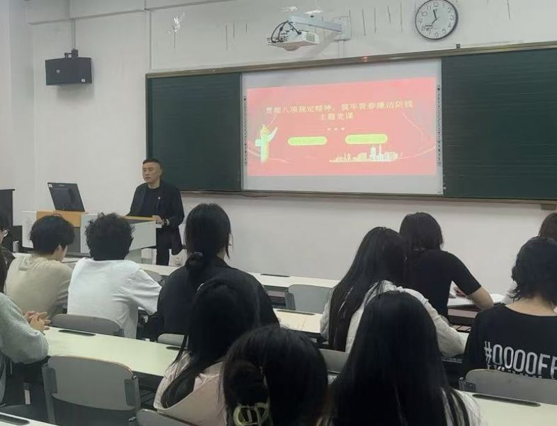 学院党总支书记郑晓丹以《中央八项规定精神:新时代青年砥砺优良作风的永恒坐标与行动纲领》为题,为师生党员和积极分子代表讲授专题党课。