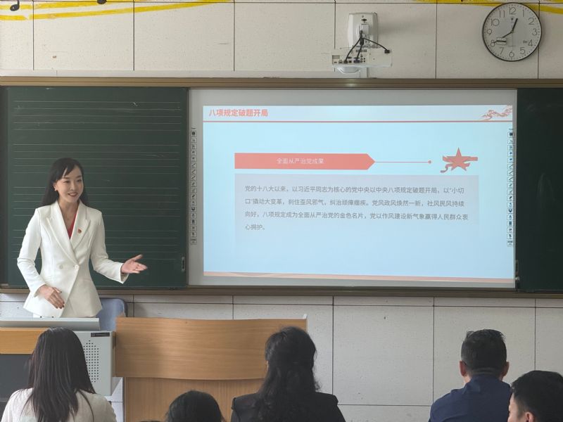 党课结束后,党总支书记姚艳秋作总结讲话并提出要求。姚艳秋对两位支部书记的精彩授课给予充分肯定,她指出,此次学习教育内容丰富、意义深远,全体参会人员要深刻领会中央八项规定精神的重要内涵。一是要将中央八项规定精神内化于心、外化于行,在日常工作和生活中严格遵守各项规定,坚决抵制不正之风;二是要以身作则,发挥模范带头作用,以优良的作风影响和带动身边人;三是要将中央八项规定精神与实际工作紧密结合,在教学、科研、管理等各项工作中,切实提高工作效率和服务质量。
