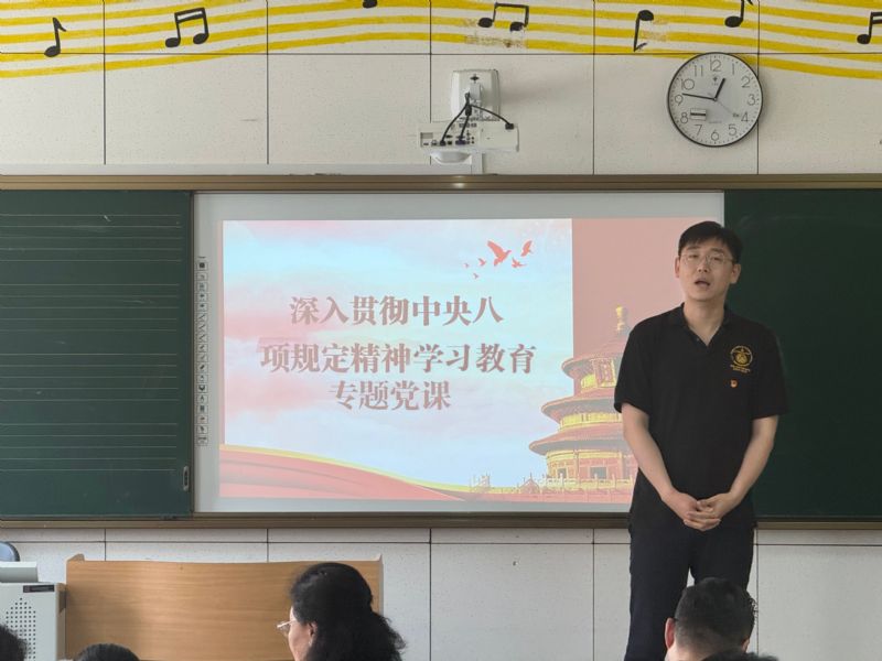 紧接着,教师党支部书记魏新宇以《深入贯彻中央八项规定精神学习教育,推动教育事业高质量发展》为主题展开授课。魏新宇首先回顾了鲁艺时期,师生在极端艰苦的条件下坚守教学的事迹,彰显了共产党人自力更生、艰苦奋斗的优良传统。随后,他从教育者的“加减乘除”四则运算入手,剖析了如何在教育岗位上落实中央八项规定精神,强调要持续纠治“四风”,加强监督机制建设,让中央八项规定成为干事创业的制度保障和作风底线。