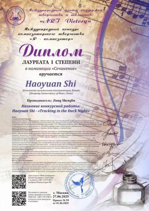 在2025年俄罗斯“作曲家”国际作曲比赛中,作曲系2024级研究生史皓元创作的室内乐作品《幽夜觅踪》荣获一等奖。(指导教师:姜盛林)