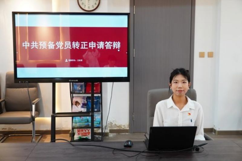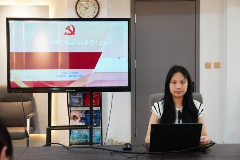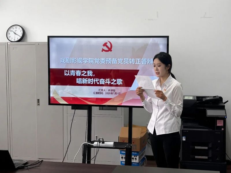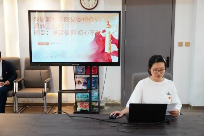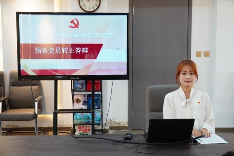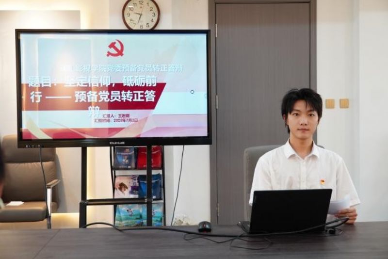 答辩过程中,各位预备党员依次登台,通过PPT演示的方式系统汇报了预备期间的成长轨迹。从政治理论学习中对党的路线方针政策的深刻领悟,到专业领域中将社会主义核心价值观融入戏剧影视创作的具体实践;从志愿服务、实习实践中的责任担当,到直面自身不足的清醒认知与改进决心……每一段个人汇报都体现出新时代青年党员对信仰的坚守、对理想的追求。评委们围绕党的创新理论、时政热点以及专业实践与党性锻炼有机融合等方面提出问题。预备党员们的回答条理清晰并紧密结合个人实际,展现出良好的理论素养与强烈的责任意识。