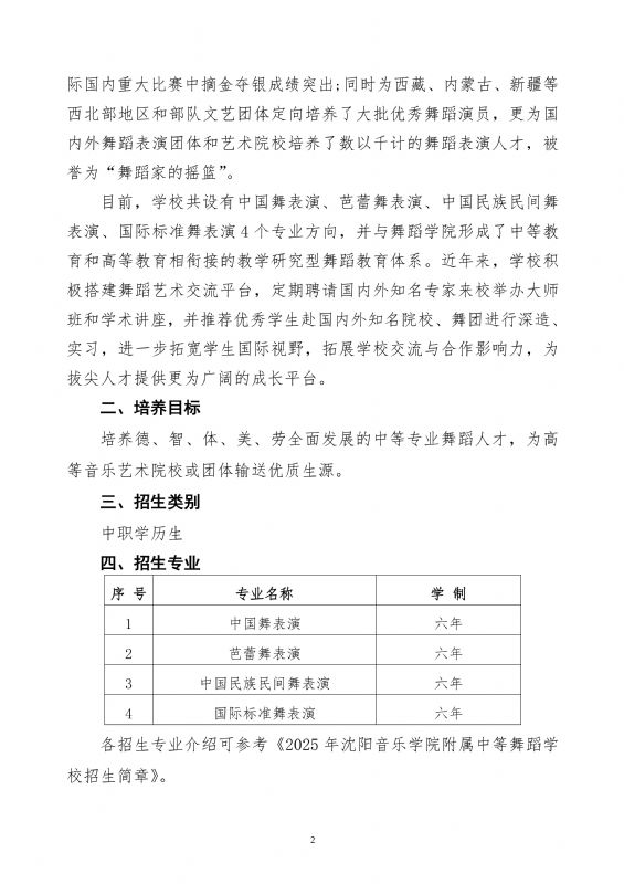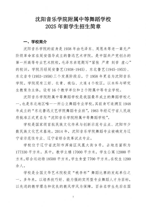 沈阳音乐学院附属中等舞蹈学校2025年留学生招生简章