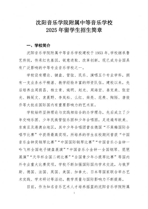 沈阳音乐学院附属中等音乐学校2025年留学生招生简章