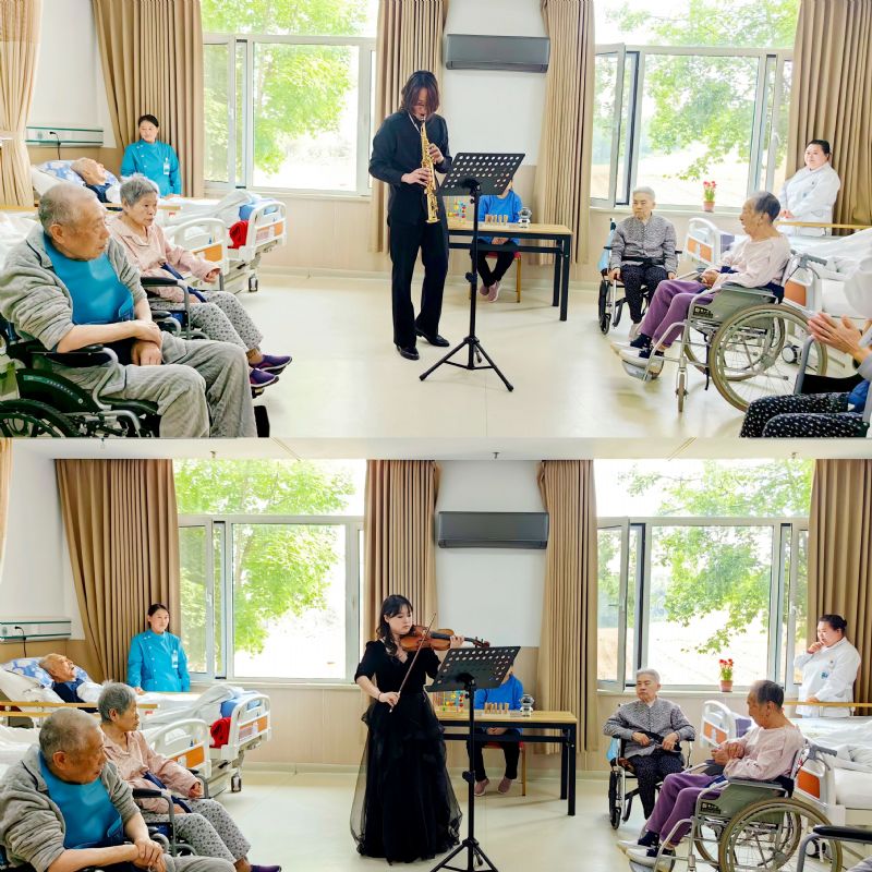 活动期间,红色文艺轻骑兵小分队深入静安医院患者病房,为行动不便的老人送上《草原上升起不落的太阳》《游击队之歌》等经典曲目,为承受治疗压力的患者送去心灵慰藉,这种“零距离”的演奏形式,不仅用音乐传递了党的关怀与温暖,更让师生党员深刻体会到艺术服务人民的价值。当西洋乐器的琴弦与患者的心跳同频共振,红色文艺轻骑兵真正成为了连接党心与民心的桥梁,让思政温度直达基层一线。