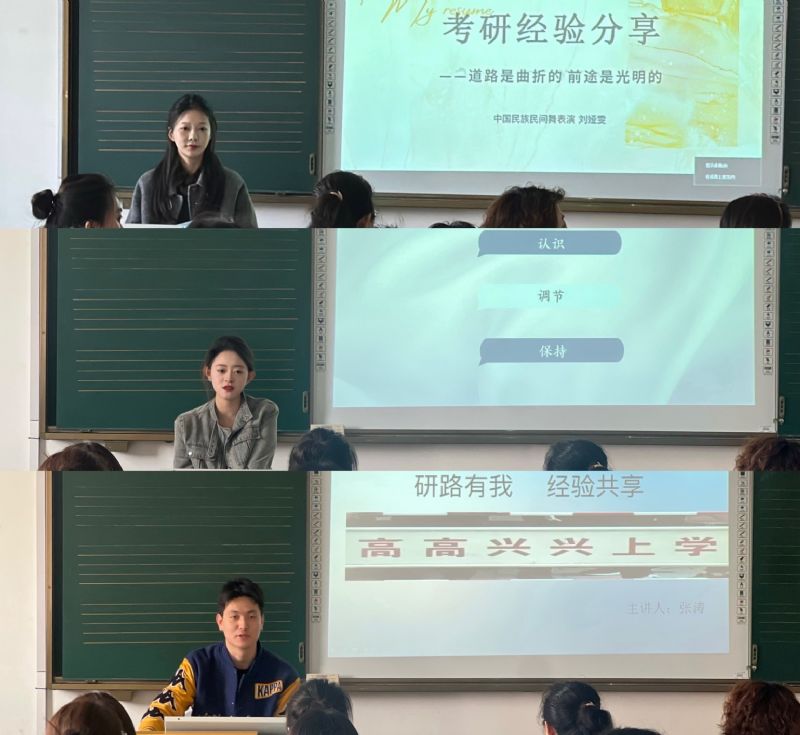 分享会上,2023级中国民族民间舞表演方向研究生刘娅雯以“精准规划”为主题,建议有考研计划的同学们尽早选择学校,熟悉目标院校考试内容,为大家介绍了专业课简答题的答题技巧,鼓励同学们明确目标,不要轻易放弃;2023级中国民族民间舞表演方向研究生周怡莹向同学们分享了自己的考研心得,强调合理分配时间的重要性,建议同学们根据自身情况制定阶段性目标;2023级中国民族民间舞表演方向研究生张涛提醒大家英语备考被比作“持久战”,词汇的积累是基础。此外,历年真题尤其是阅读理解部分至关重要,可以通过分析出题规律和长难句结构来提升解题能力。