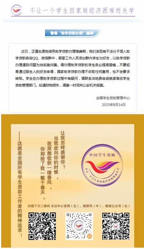 资助育人 | 全国学生资助管理中心2025年第3号预警: 警惕“助学贷款办理”骗局