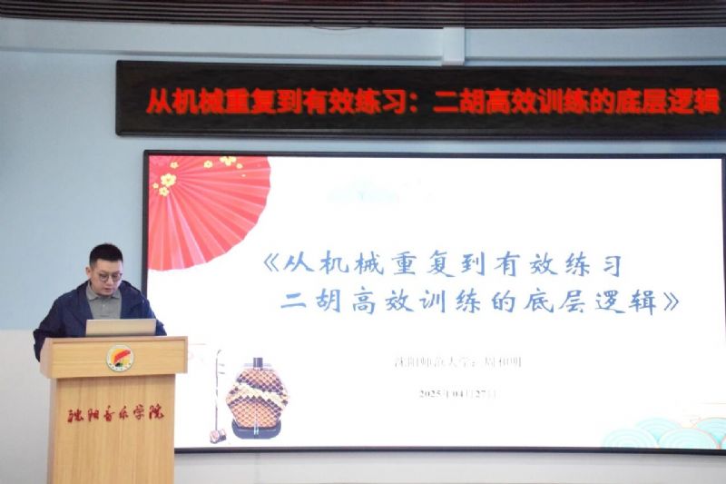 •       2025年4月27日,沈阳师范大学戏剧艺术学院周和明教授应邀为音乐教育学院师生进行了一场题为《从机械重复到有效练习:二胡高效训练的底层逻辑》的专题讲座。音乐教育学院领导班子成员、民族器乐教育系教师及学生等80余人参加本次活动。讲座由民族器乐教育系副主任李家仑主持。