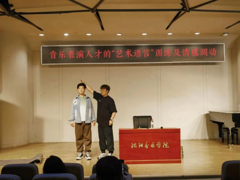 在表演解放天性环节,刘德权教授围绕钢琴表演展开,以形体训练、眼神运用等为切入点,深入讲解如何在舞台上自然展现自我。从上台时的从容仪态到下台时的优雅谢幕,每一个细节都被赋予艺术表达的意义。他着重强调,表演与钢琴演奏紧密相连,鼓励同学们突破传统表演框架,在舞台上充分释放天性,让演奏更具感染力。