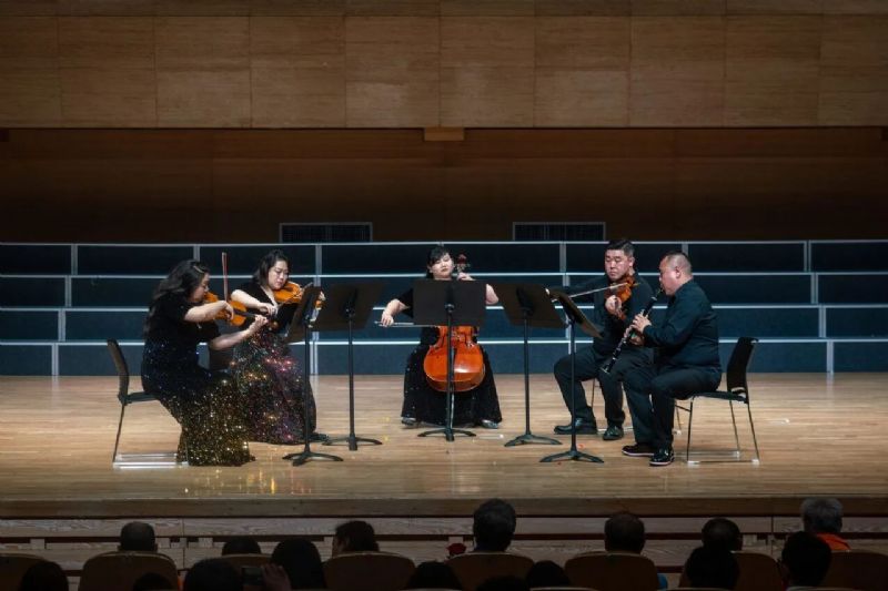 单簧管与弦乐四重奏《礼赞中国》,通过独特的乐器组合和精彩的演奏,礼赞了伟大的中国。演奏者:郝宇晴(单簧管) 李雯隽(第一小提琴)张 姝(第二小提琴)韩 丹(中提琴)芦晓婷(大提琴)