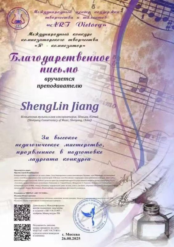 在2025年俄罗斯“作曲家”国际作曲比赛中,作曲系2021级本科生尹紫腾创作的小型乐队作品《Forest.》荣获一等奖。(指导教师:姜盛林)