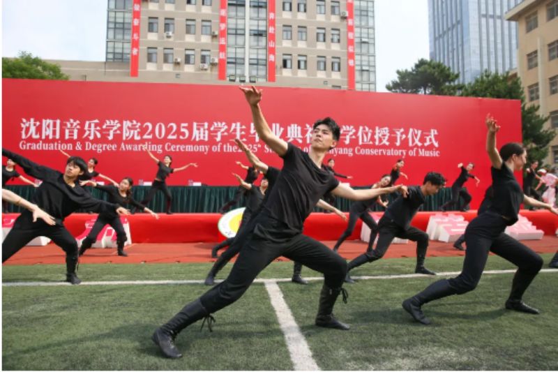 典礼开始前,“川子唢呐”——2015届校友孙名川与民族器乐系14名学生、现代音乐学院4名学生联袂演奏电影《哪吒·魔童闹海》主题曲《就是哪吒》,高亢嘹亮的唢呐声与动感十足的电音节奏激情碰撞,展现了民族乐器与现代电音的完美融合,瞬间点燃全场的激情。“少年应有鸿鹄志,敢踏风浪破苍穹”,随后舞蹈学院40名学生表演了洒脱俊美的蒙古族舞蹈,他们扬臂似鸿雁高飞,轻踏如骏马踱步,既象征着2025届毕业生“天高任鸟飞”的宽广未来,也寓意着毕业生们“骏马踏平川”的美好图景。“踏浪驭飞舟、千帆竞出征”,现代音乐学院、国际教育学院15名学生与声乐歌剧系8名学生梦幻联动合唱歌曲《当离别开出花》《未来我来》,流行韵律交织美声咏叹,时尚与古典共鸣,唱出了沈音学子逐梦前行、奔赴山海的自信从容和未来我来、勇担使命的挺膺担当。全体毕业生牢记母校嘱托,传承红色基因,赓续红色血脉,在民族复兴的征程上展现沈音学子的青春风采,施展艺术才华报效家国。