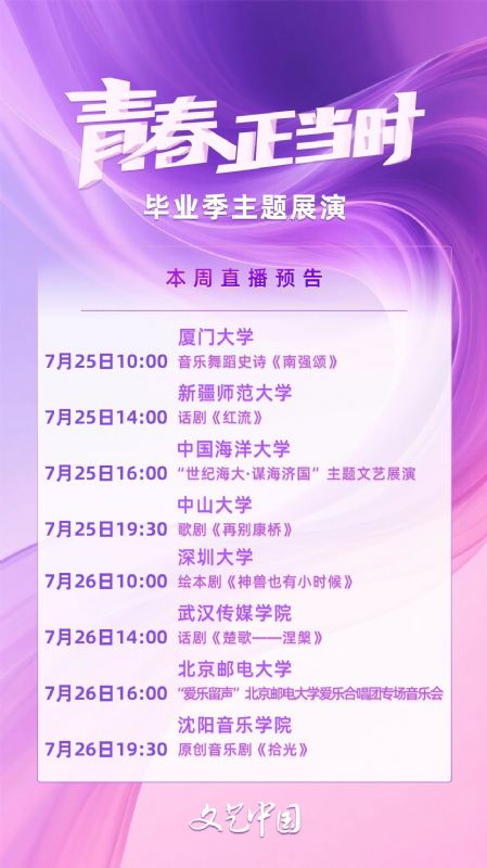 展播时间:7月至8月(每日3-4场)观看平台:“文艺中国”(视频号、抖音、快手、哔哩哔哩、微博),并联合人民日报“视界”、光明网、文旅中国、一通文化等平台同步呈现。