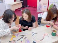活动现场,现代音乐学院党总支副书记郎彩飞化身文化使者,以渊博的学识与生动的讲述,将端午节庆习俗、中医药文化与传统手工艺的历史脉络徐徐铺展。她手持承载吉祥寓意的传统纹样图纸,以精湛的技艺分步演示荷包制作的全过程。从裁剪蕴含福禄寿喜的彩绸,到运用盘金绣、锁边绣等传统针法勾勒立体造型;从填充艾叶、藿香等具有安神驱蚊功效的中草药,到缀以流苏珠串赋予灵动韵致,每一道工序都承载着中华民族的审美意趣与生活智慧,彰显着深沉的文化自信与精益求精的工匠精神。