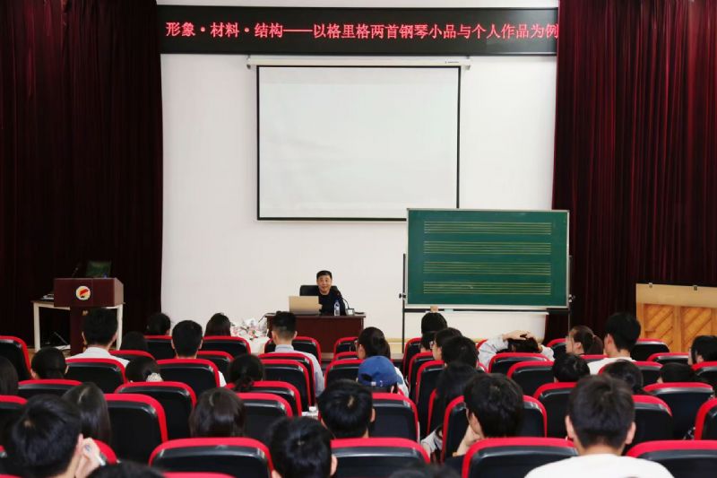 欢迎仪式后,专题讲座正式拉开帷幕。郭鸣教授以“音乐作品曲式结构”为核心,凭借深厚的专业积淀与丰富的教学经验,将抽象的音乐理论转化为通俗易懂的讲解:从乐段、乐句到乐节的层级划分与差异化特征,再到曲式结构搭建的底层逻辑,他结合自身多年的创作案例,将理论知识与实践经验紧密结合,让在场师生快速把握核心要点。讲座重点环节,郭鸣教授以挪威作曲家格里格的经典钢琴小品《小鸟》《致春天》为分析样本,从曲式结构的“三部性”框架入手,深入拆解作品的动机材料发展、和声语言设计、调式调性转换等关键维度,不仅清晰呈现了经典作品的创作思路,更针对附中作曲专业学生的学习痛点,提炼出可复用的创作方法,为学生日常创作提供了精准指引。