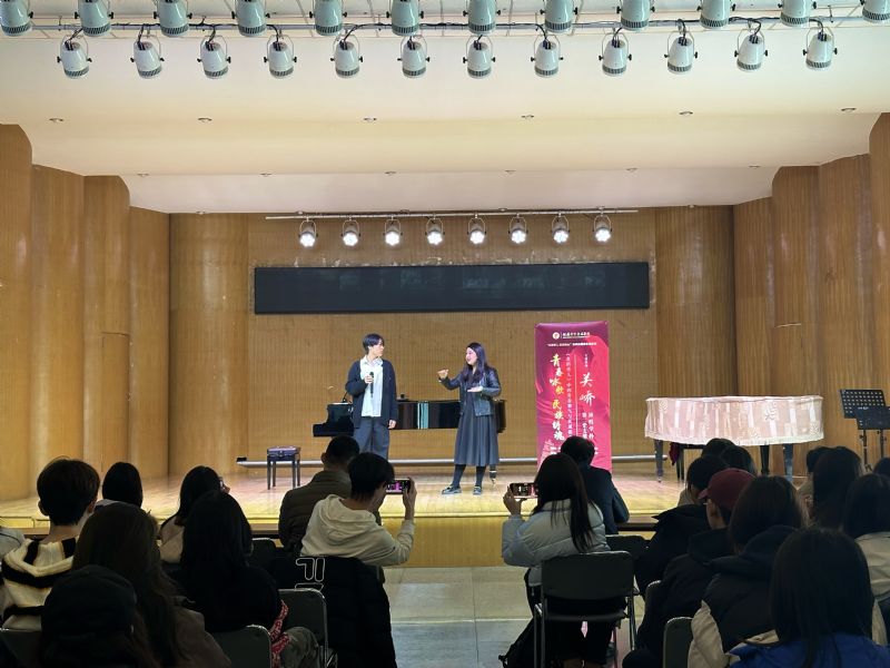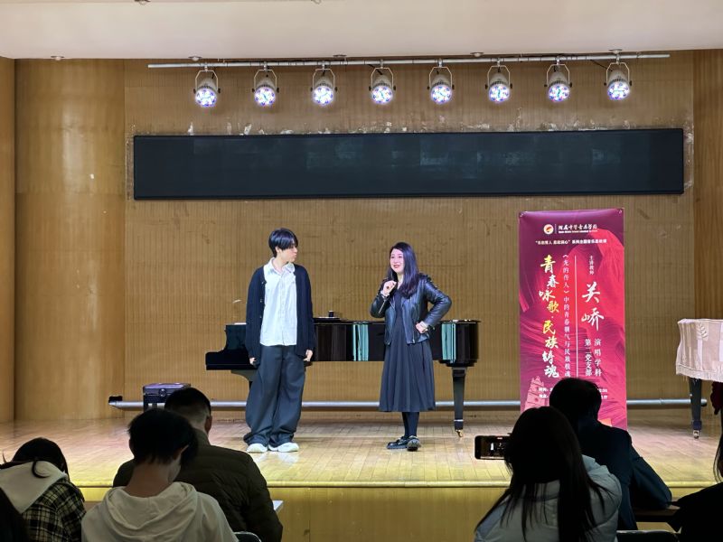 演唱学科关峤在“青春咏歌·民族铸魂——《龙的传人》中的青春朝气与民族根魂”公开课上,以歌为媒、以问为引,将思政教育深植音乐课堂。她逐句拆解“黑眼睛黑头发黄皮肤,永永远远是龙的传人”的文化意蕴,从“龙”的图腾起源讲到“血脉相连”的民族认同等引导式提问,激发学生主动思考。教唱环节,她逐字纠正咬字、打磨情感、指导呼吸,将“细致入微”落在每个音符上。其以音乐为桥,让《龙的传人》升华为青春宣言,在旋律、问答、示范、演唱中厚植民族根魂,用歌声为青春注入“强国有我”的底气。