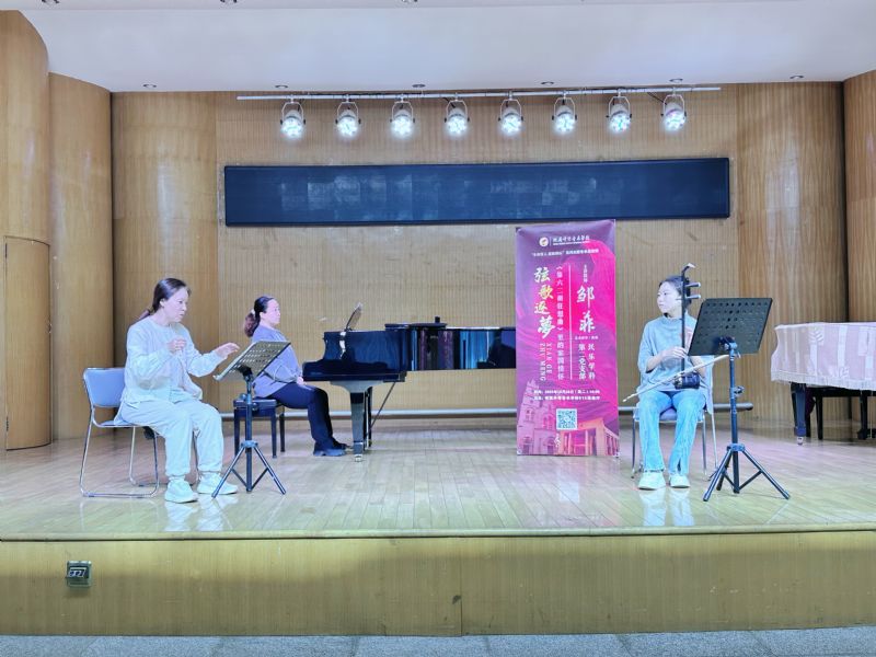 课上,第二党支部党员、民乐学科教师邹菲首先回溯创作背景:这部作品不仅是技巧的展现,更藏着作曲家对西藏的深情向往——慢板的悠扬是对雪域高原的礼赞,快板的激昂是对民族团结的咏叹。随后,她结合乐谱逐段拆解:慢板段落中,她指导学生要运弓如缕、揉弦细腻,将“雪山融水般的旋律”与“牧民生活的烟火气”娓娓道来;在快板节奏处,要手腕灵活翻转、跳弓清脆利落,模拟出“赛马会上的欢腾”“建设者们的号子”。学生在教师的指导下,从“拉准音符”进入“拉出情感”。正如她在总结中所说:“我们弦歌的不仅是旋律,更是《第六二胡狂想曲》里的家国情怀。同学们当以琴弓为笔,在传统与现代的交织中,写就‘守得住乡音、奏得出家国’的逐梦乐章!”