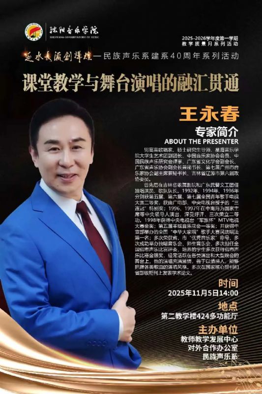 预告!延水长流创辉煌——民族声乐系建系40周年系列活动 | 王永春教授《课堂教学与舞台演唱的融汇贯通》讲座 沈音民族声乐系 2025年11月3日 13:32 辽宁