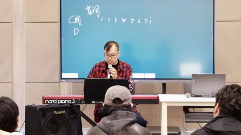 在对和弦进行体系系统梳理后,徐潇聚焦Latin Groove、Funk Groove与Blues音乐三大实用即兴手法,结合不同风格的音乐特征与场景化应用需求,以生动鲜活的钢琴演示为载体,深入浅出地解析了节奏编排、风格融合的核心技巧,不仅拓宽了同学们对即兴演奏的认知边界,更激发了现场学生们的创作热情。在课程尾声的互动答疑环节中,徐潇耐心回应学生们的提问,有针对性地解答了同学们在即兴演奏中的实操困惑,现场交流互动氛围热烈融洽。