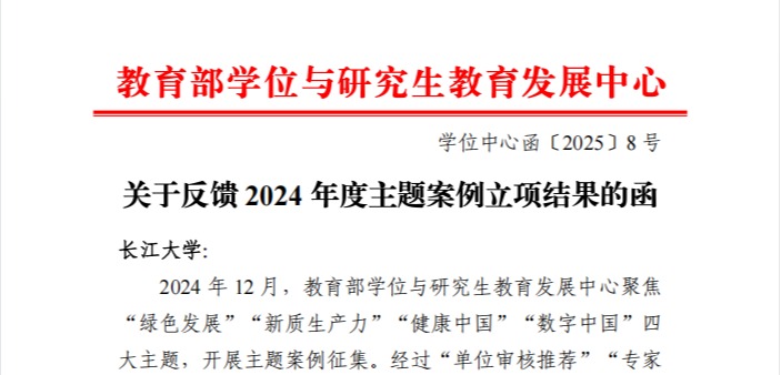 近日,教育部学位与研究生教育发展中心、中国专业学位案例中心公布了2024年度主题案例征集评审结果,我校共有2项案例获得立项,具体名单见下表。2024年度主题案例征集围绕“绿色发展”“新质生产力”“健康中国”“数字中国”四个主题开展,共有365家研究生培养单位申报了1831申报项目。遵循“质量优先、分类建设、统筹协调”的原则,经过“单位审核推荐”“专家分组评议”“案例专家委审核”三级评议审核,最终307家单位的794...
