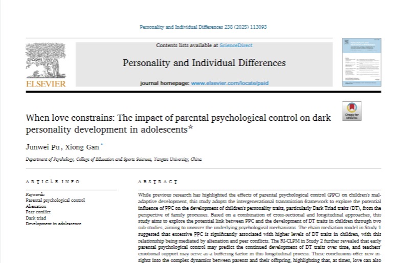 近日,长江大学教育与体育学院甘雄博士及其研究生团队在国际权威期刊《Personality and Individual Differences》与《Research on Child and Adolescent Psychopathology》先后发表了题为When love constrains: The impact of parental psychological control on dark personality development in adolescents和Through a Dark Lens: A Longitudinal Study on Dark Triad Traits, Future Negative Insight, and Antisocial Atti...