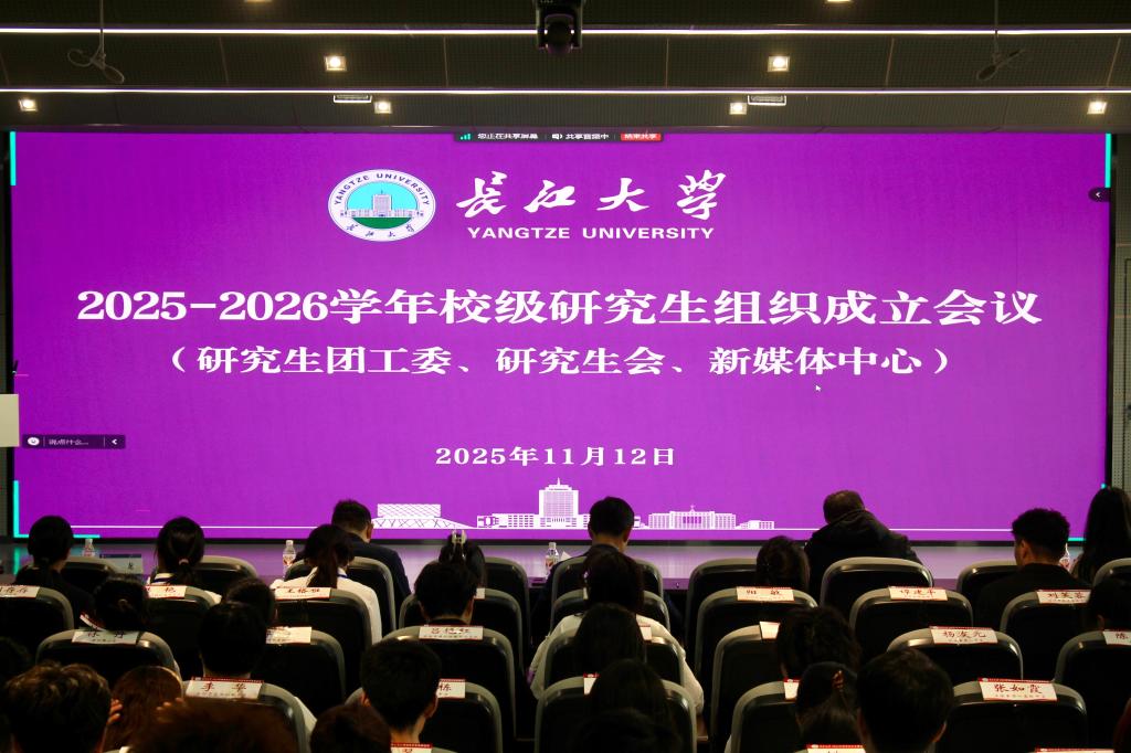 (通讯员 田泽琳 郭梓钰)11月12日下午,长江大学2025-2026学年校级研究生组织成立会议在东校区16教A313召开,武汉校区设分会场同步视频参会,会议由党委研究生工作部副部长黄龙主持。会议在庄严的国歌声中拉开帷幕。会议上,校团委副书记信晓阳老师宣读了《关于长江大学2025-2026学年校级研究生组织成员任命的决定》。授旗仪式环节庄重而神圣。党委研究生工作部部长关辉老师依次为研究生团工委、研究生会、研究生新媒体中心授...