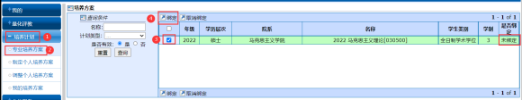 ①绑定专业培养方案:培养计划-专业培养方案-勾选-点绑定。图一