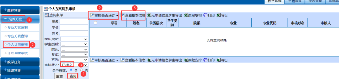 ⑤提交审核。我的培养方案-勾选-制定下拉键▼--查看已选课程或提交审核-培养单位审核通过后-打印出来给导师审阅。如果导师提出修改意见,必须由研究生秘书老师先取消审核,审核通过或取消审核见图十四,研究生方能在教务系统修改个人计划。(见图八-图十三)。