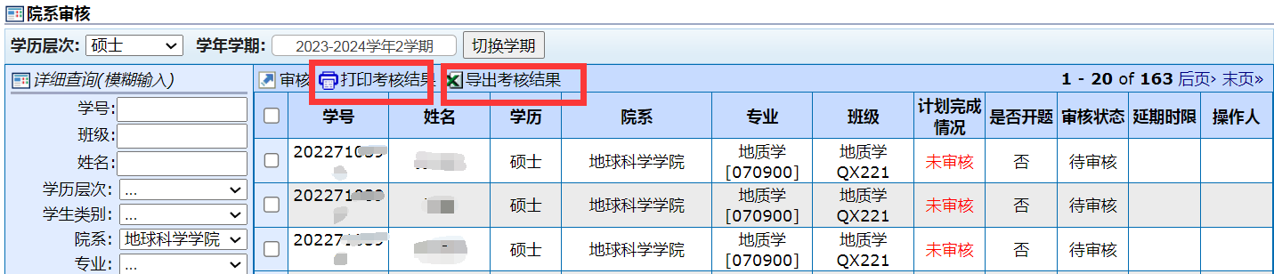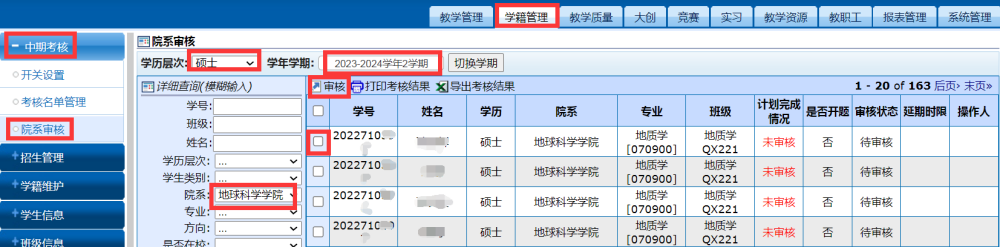 3、中期考核。培养单位组织中期考核,研究生秘书老师在线完成院系审核。