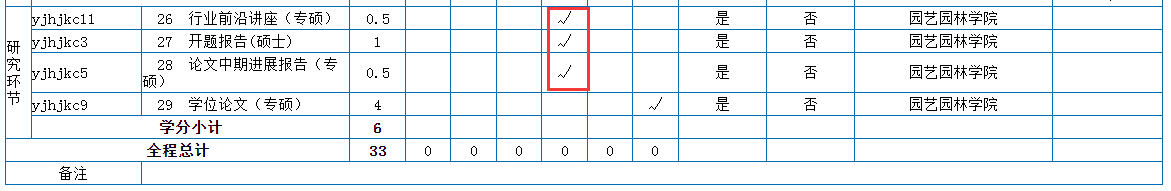 2、从2020级开始,行业前沿讲座、开题报告、学位论文中期进展和学位论文均纳入培养方案计算学分,以上研究环节也需要选课。