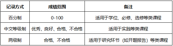 5.成绩记录方式分为百分制、中文等级制和两级制,详见下表: