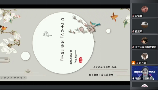马克思主义学院的杨鑫同学以新时代好老师的意蕴为切入点,综合教师职业道德和“四有”好教师的概念内涵,从好老师之魂、好老师之根、好老师之基、好老师之源四个方面对“十六心”进行细致化阐述,将新时代“四有”好老师意蕴展示出来。呼吁立足新时代,每一位教师都应不负时代所托,躬身教育、潜心育人,做党和人民满意的好老师,做好中华民族“梦之队”的筑梦人。