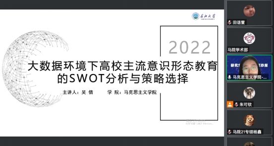马克思主义学院的吴倩同学向大家介绍了大数据环境下高校主流意识形态教育的SWOT分析与策略选择。借助SWOT分析法,从背景与意义、思路与方法、透视与应对这三个方面,以借势而为、协同育人、主次分明的应对方式,为高校主流意识形态教育提供新思路、新方法。