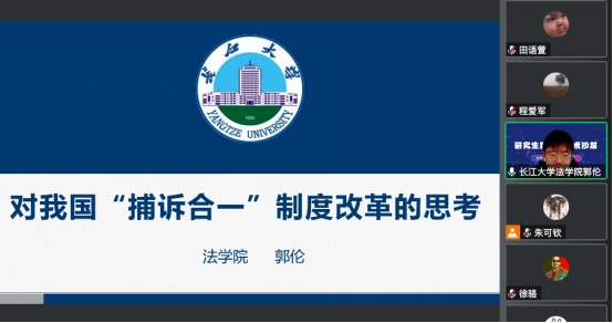 法学院的郭伦同学以新时代司法体制改革的举措为出发点展开分享,从”捕诉合一“的时代背景、价值分析、争议与完善建议四个方面进行介绍,并结合理论与现状进行分析,有力地呈现了对我国“捕诉合一”制度改革的新思考。