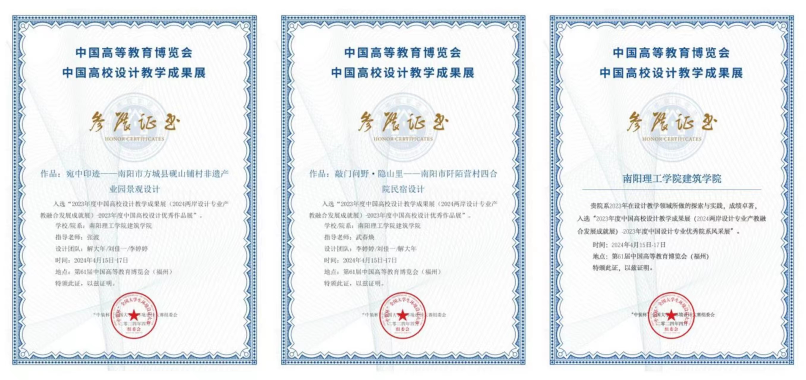 本网讯(记者/武春焕)4月15日,由中国高等教育学会主办的第61届中国高等教育博览会在福州海峡国际会展中心举行。南阳理工学院在博览会高校专区参加会展,我校6686体育入选“2023年度中国高校设计教学成果展(2024两岸设计专业产教融合发展成就展)—2023年度中国设计专业优秀院系风采展”,6686体育环境设计专业两名学生作品入选“2023年度中国高校设计教学成果展(2024两岸设计专业产教融合发展成就展)—2023年度中国高校设计优秀作品展”,并在中国高校专区参加展览。