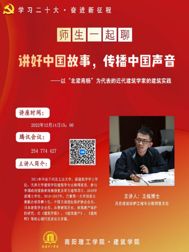 本网讯(记者/余淑君 牛烨 田真)12月14日下午,我院“师生一起聊”系列讲座第二讲《讲好中国故事,传播中国声音——以“北梁南杨”为代表的近代建筑学家的建筑实践》于线上顺利举行,我院历史建筑保护专业博士王巍老师担任主讲。