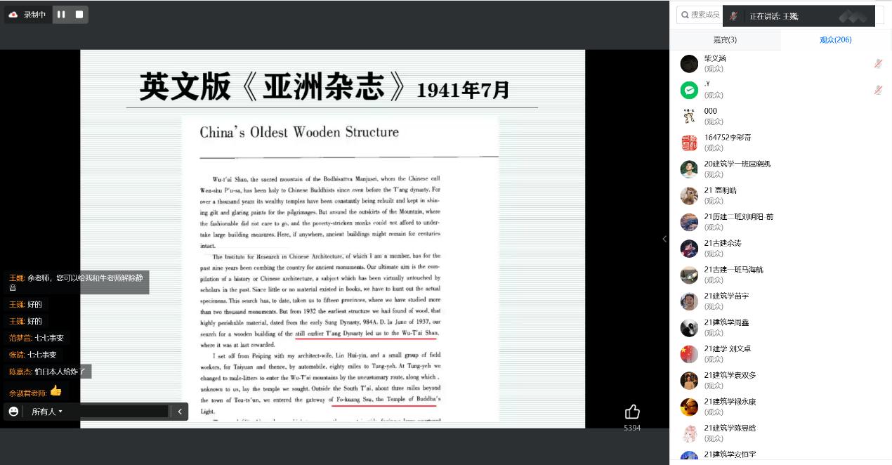 讲座中,王巍老师在为大家在介绍中国建筑学的产生背景时讲到,清末民初,中国的建筑学逐渐起步,西方和日本对中国古建筑的评价有失公允,以梁思成、杨廷宝等人为代表的第一代建筑师开始进行古建筑调查与修缮、构建中国建筑史、设计符合中国国情和社情的建筑等一系列实践,并通过参与国际竞赛、撰写英文书籍、参与国际学术交流,积极发出中国声音,为中国古建筑“正名”,体现了强烈的传统文化情结和爱国精神。