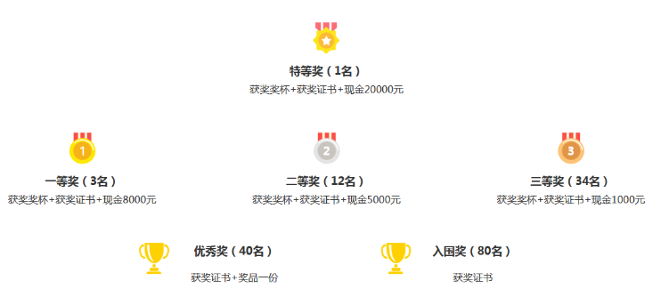 特等奖 1 名,获奖奖杯、证书及奖金 20000 元。