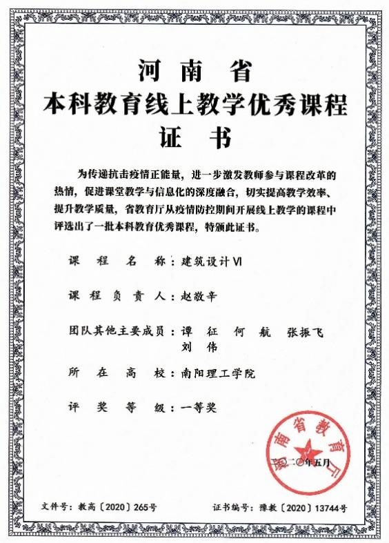 近日,河南省教育厅下发《关于公布河南省本科教育线上教学优秀课程评选结果的通知》(教高〔2020〕265号)。我院赵敬辛老师团队的“建筑设计Ⅵ”课程荣获一等奖,这是我院本科教学课程建设方面取得的又一项优异成绩。