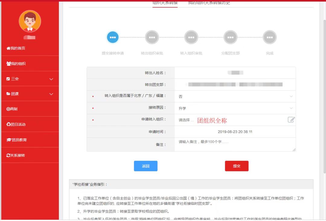 注意:所有团员在网上发起团关系,转入时需注明所录取专业。以上线上、线下两个步骤全部完成,标志团组织关系转接成功。