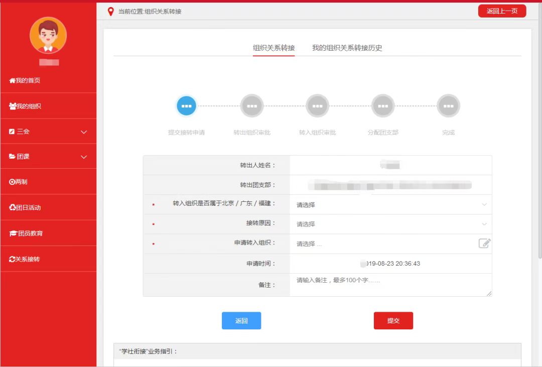 选择申请转入组织及接转原因并提交