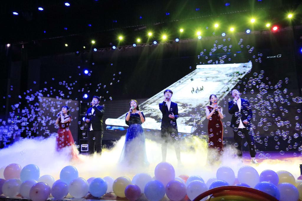 本次晚会以我院教职工及高年级同学录制的迎新寄语视频为开端,为晚会制造了热烈的气氛。在现场观众们期待的欢呼声中,四位主持人宣布晚会正式开始。晚会以“筑梦踏星河,一玖绘韶华”为主题,18、19级学生带来的《butter fly》荧光舞拉开了晚会的序幕,演出共分为三个表演环节。