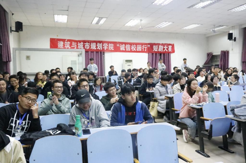 为深入贯彻全省教育工作大会精神,落实立德树人根本任务,促进高校诚信校园文化建设,11月16日晚19时,建筑与城市规划学院于五阶二教室举办“诚信校园行短剧大赛”活动,部分17、18级同学担任评委,全体19级同学到场观看,郑海、秦嘉琪全程主持。