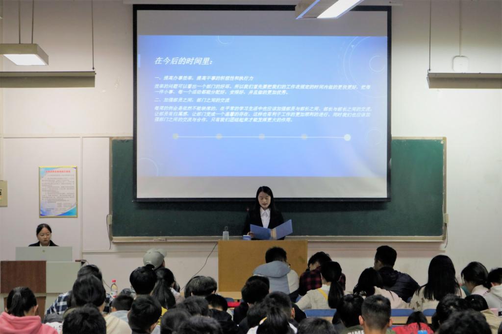 首先张超老师向第十五届学生会部长颁发任职聘书,并合影留念。随后部长换届选举仪式正式开始,此次共有41位竞选者分别竞选16个学生会部门的部长。他们都身着正装轮流上台进行竞选演讲,对未来的工作提出构想与规划,针对怎样去实践、在部门里该如何去做、如何实现目标提出了自己的见解。并且总结了各自在工作中的优势与不足,对其他部门提出了自己的认识,就如何加强学生会内部建设等问题提出了自己的建议,充分展现了新一届各部长候选人对未来蓝图的美好构想。