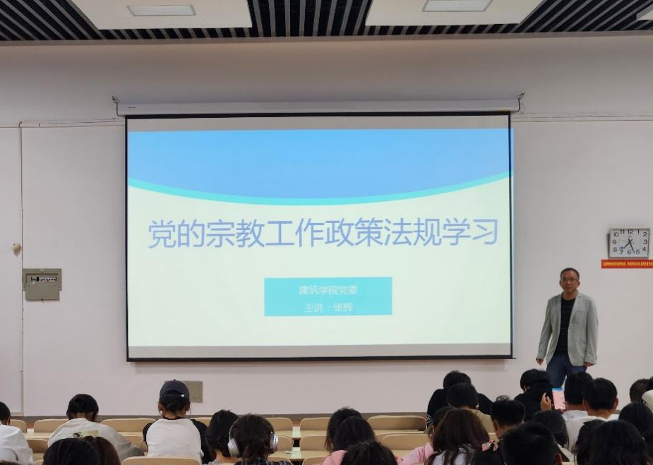 本网讯(学生记者/贾欣豪)为引导新生全面深入学习党的宗教工作政策法规相关知识,10月16日晚,我院于7阶101报告厅“党的宗教工作政策法规学习”专题讲座。我院党委副书记张辉担任主讲人,全体23级学生到场参加。