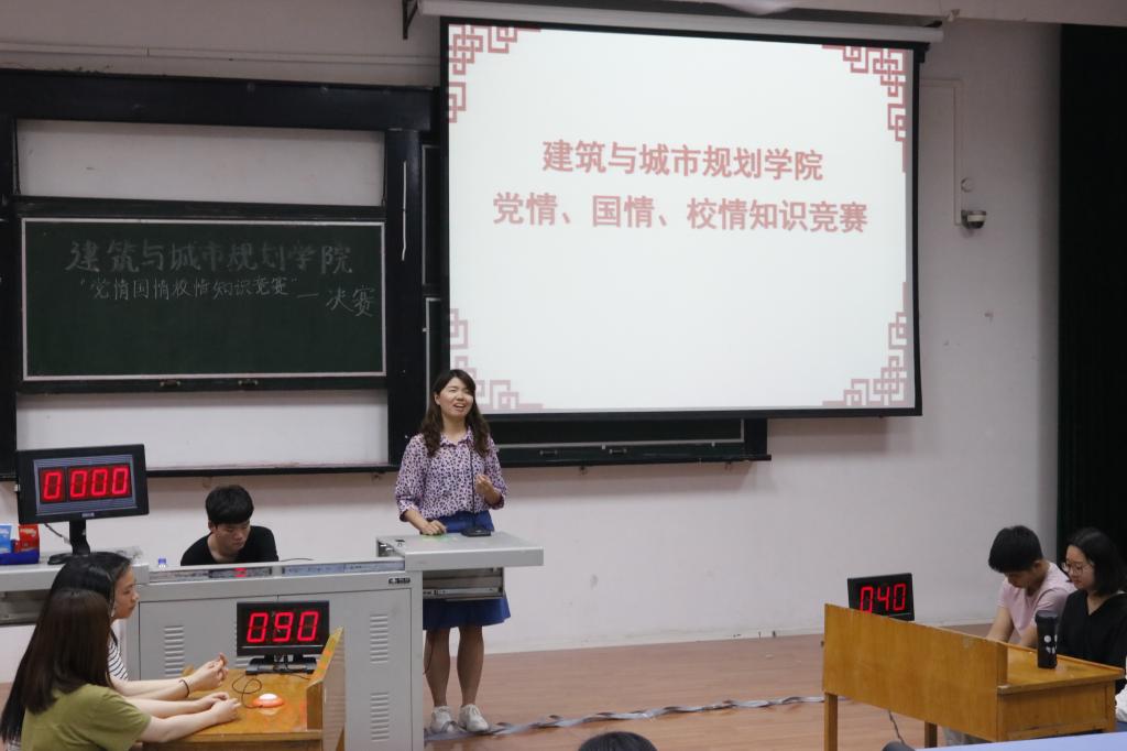 为推动广大党员将习近平新时代中国特色社会主义思想和党的十九大精神学深学透、入脑入心,增强大学生做合格党员的思想自觉和行动自觉,5月16日晚,建筑与城市规划学院在五阶二教室特举行“党情、国情、校情”知识竞赛。团学办公室主任暨18级辅导员杜鹤出席了本次比赛。