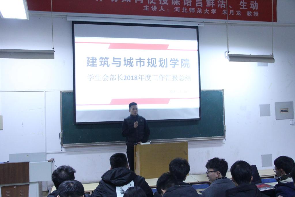 12月26日晚七点,建筑与城市规划学院召开学生会部长2018年度工作总结大会。第15届学生会主席团、学生会各部门部长及2018级全体新生参加了此次活动。