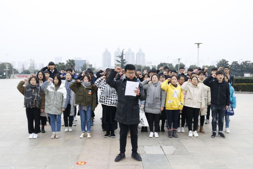 活动主要分为三部分。首先,主持人带领参与者参观解放广场纪念碑并讲述其发展历程和历史意义,让参与者在了解南阳抗战历史的同时,增强了他们的爱国责任感;之后,由王政同学带领全体同学宣誓,铿锵有力的誓词激起了在场学生的爱国情怀;最后,在南阳解放纪念碑的下,全体参与者在“砥砺前行,勿忘国耻,缅怀先烈,爱国明志”横幅上庄严签字,立志要为中华民族的伟大复兴奉献自己的力量。